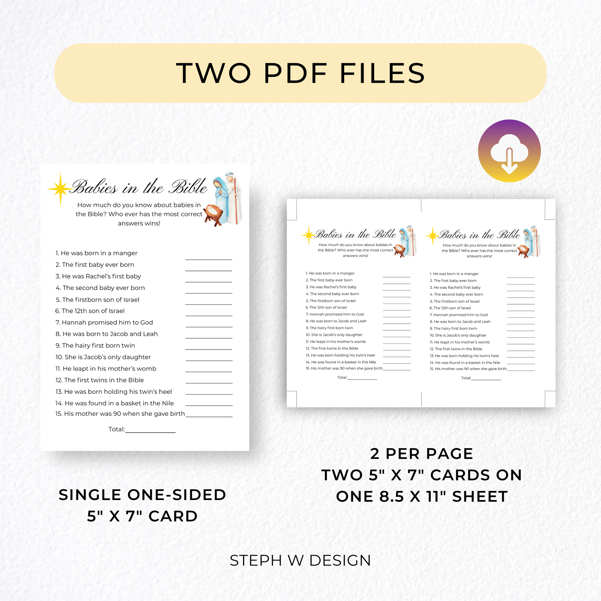 The "Babies in the Bible Game" is a delightful and engaging activity designed for your Christian nursery or the perfect baby shower gift. This fun, printable game will entertain guests at any baby girl or boy shower while reinforcing biblical stories in an enjoyable way.